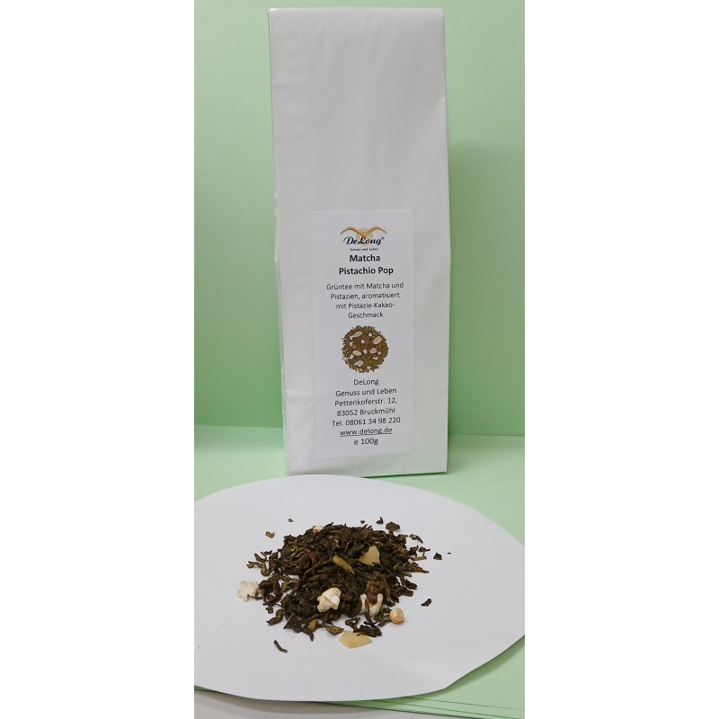 Zutaten: Grüner Tee, Aroma, Schokoladenstücke (Zucker, Kakaomasse, fettarmes Kakaopulver, Kakaobutter, Dextrose, Emulgator: Lecithin), Grüner Tee Matcha(4%), Mandelflakes, Pistazien(2,5%), Popreis