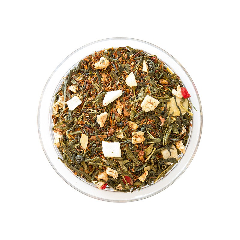 Zutaten: Grüner Tee44%, Rooibos, Kokoswürfel, Apfelstücke, Granatapfelkerne mit Fruchtfleisch 5%, gehobelte Mandeln, Jatobarinde 1%, Granatapfelblüten 1%, natürliche Aromen