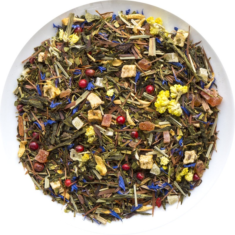 Zutaten: China Sencha, Mate (20%), Lapacho (13%), Ananasstücke, Papayastücke, Apfelstücke, Catuaba (5%), Lemongras, rosa Pfeffer, Orangenblüten, Kornblumenblüten, Katzenpfötchen, Aroma