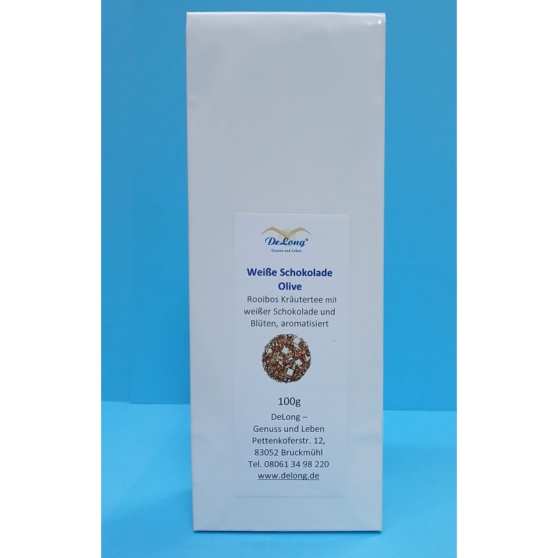 Rooibos, Olivenblätter(15%), weiße Schokostücke (Zucker, Kakaobutter, Vollmilchpulver, Emulgator: Lecithin)(10%), Aroma, Kakaoschalen, Toffeecrunch (Zucker, Glukosesirup, Wasser, Butter(Milch), Sahne(Milch), Salz, Triebmittel: Natriumbikarbonat), Saflorblüten