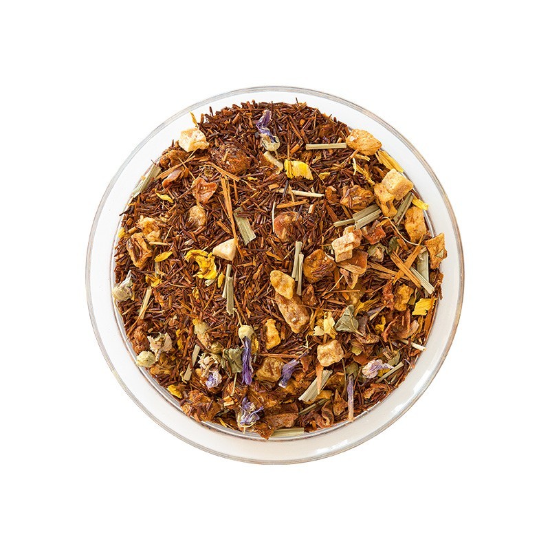 Feinster, milder Rotbuschtee aus Südafrika, veredelt mit der Regenwaldpflanze Catuaba sowie leckeren Fruchtstücken, Blüten, Lemongras und 10 lebenswichtigen Vitaminen. Dieser Tee ist völlig koffeinfrei und reizstoffarm und bei Kindern und empfindlichen Menschen sehr beliebt.