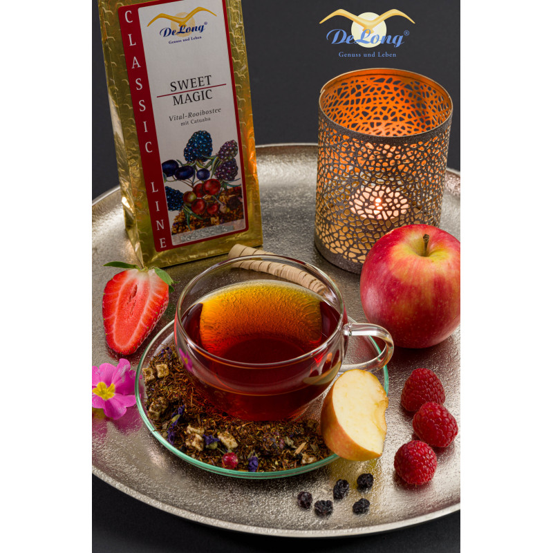 Veredelt wurde dieser Tee mit vielen Fruchtstücken und feinen Blüten. Dieser Tee ist sehr beliebt bei Kindern und empfindlichen Menschen.
