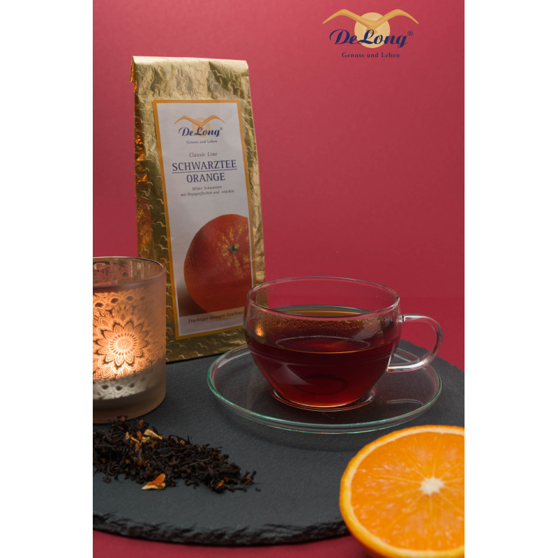Zutaten: Schwarzer Tee, Orangenschalen, Orangenflocken, Orangenstücke