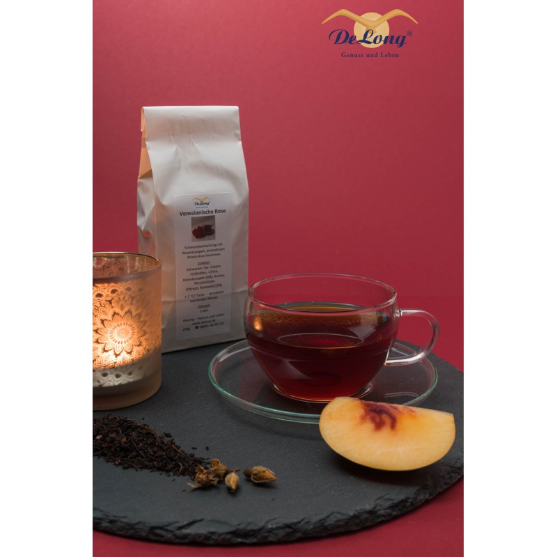 Schwarzer Tee -Ceylon, -Südindien, -China, Rosenknospen(4%), Aroma, Pfirsichstücke (Pfirsich, Reismehl)(2%)